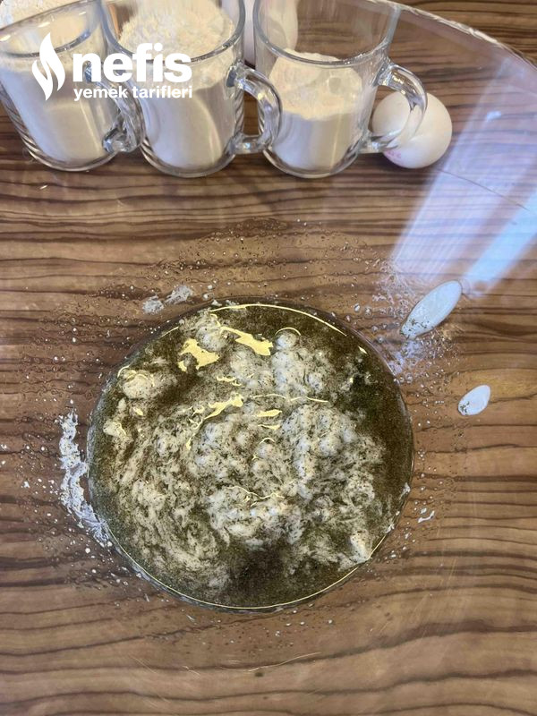 1. İlk evvel sıvı yağ, yoğurt, yumurta, dereotu, peynir ve tuzu karıştırıyoruz.