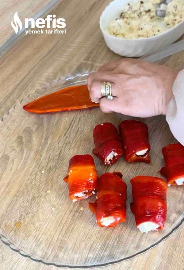 2. Fırından çıkan közlenmiş biberlerin kabuklarını soyun. Baş kısımlarını kesin, uzunlamasına ikiye bölün ve içlerini temizleyin. Geniş bir tabana serdiğiniz biberlerin içine peynirli harçtan koyun ve rulo halinde sarın.