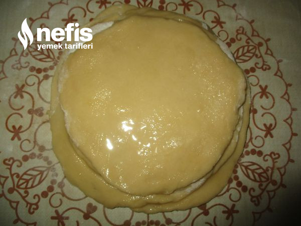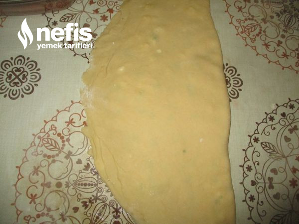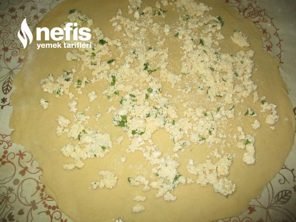- Tezgaha biraz un serpelim iki adet hamuru alalım üst üste koyalım evvel merdane ile sonra oklava ile açalımm ortasına peynirli içten serpelim.