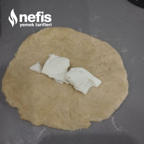 - Yoğrulmuş hamurdan kesimler alarak yuvarlak halinde açıp, içine peyniri koyarak kapatıyoruz.