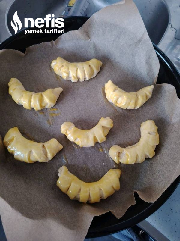 - Mayalanma bitince, ceviz büyüklüğünde bölüp açıyoruz, oval biçiminde, ve peynirli harcı koyup kapatıyoruz, aykırı tarafindan, 5/6 çizik yapıp kapatıyoruz kruvasan modeli yapıyoruz.
