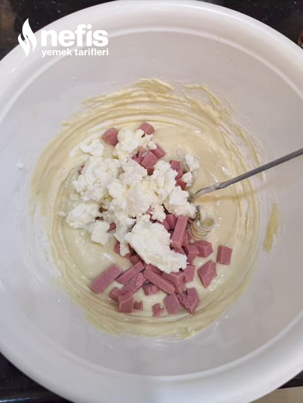 3. Hamur koyu kıvamlı olacak kıvam alana kadar karıştırın, beyaz peynir ve küp küp doğradığınız salamı ek edip 1-2 çeşit daha karıştırın yapışmaz bir tavanın tabanını çok az yağlayın tava ısındıktan sonra hamurdan birer yemek kaşığı koyalım ve hafif yayalım.