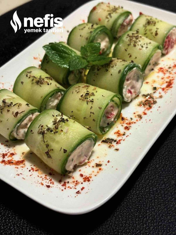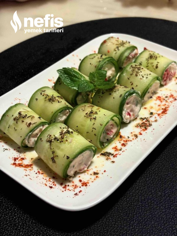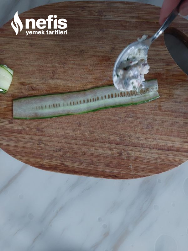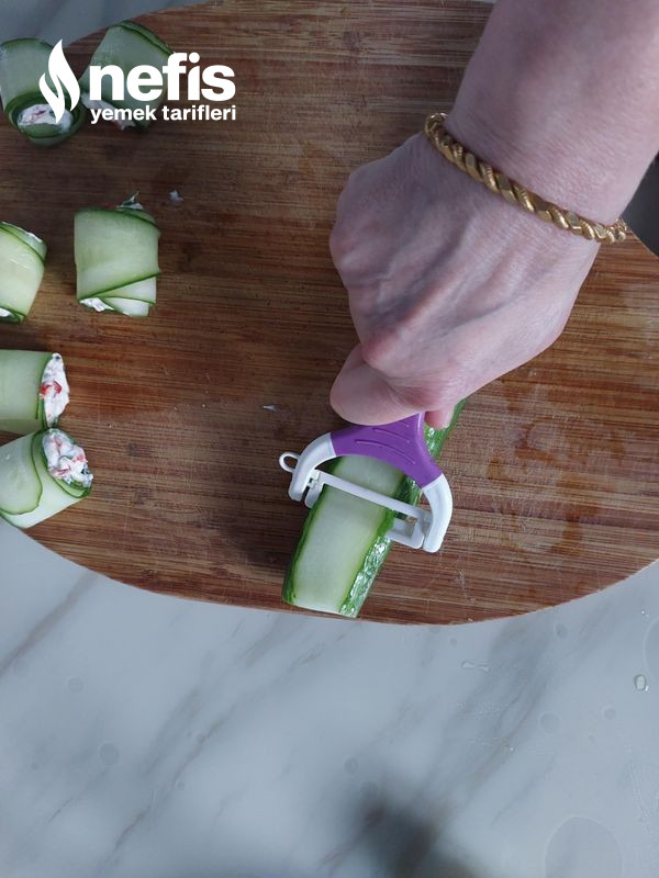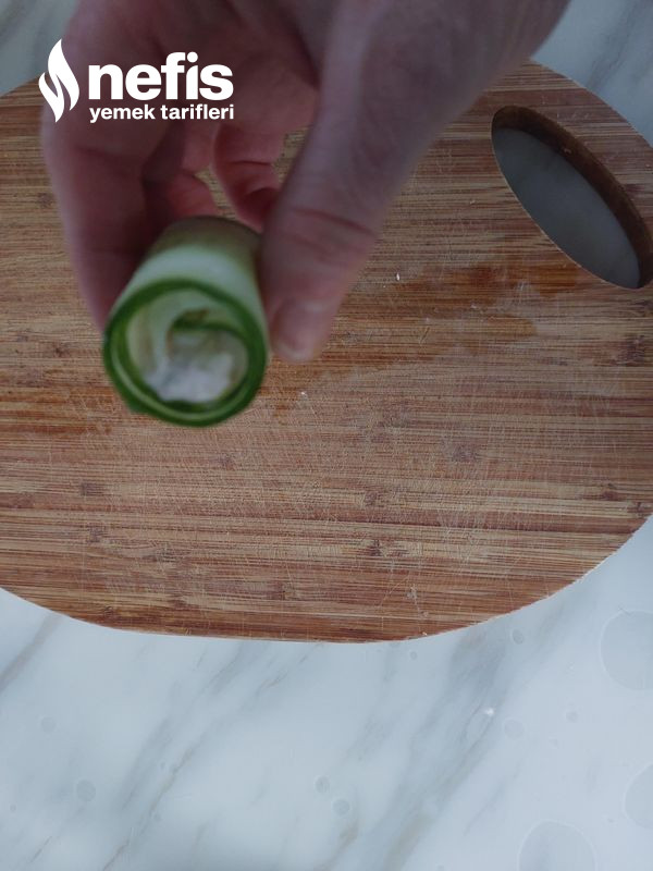 - Salatalıkları soyma aparatı ile ince ince dilimleyiniz dilimlemiş olduğunuz salatalıkların uç kısmına hazırlamış olduğunuz harçtan koyup rulo formunda sarınız, hepsine birebir süreci yapınız.