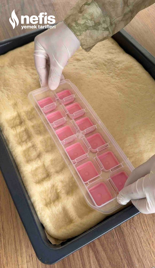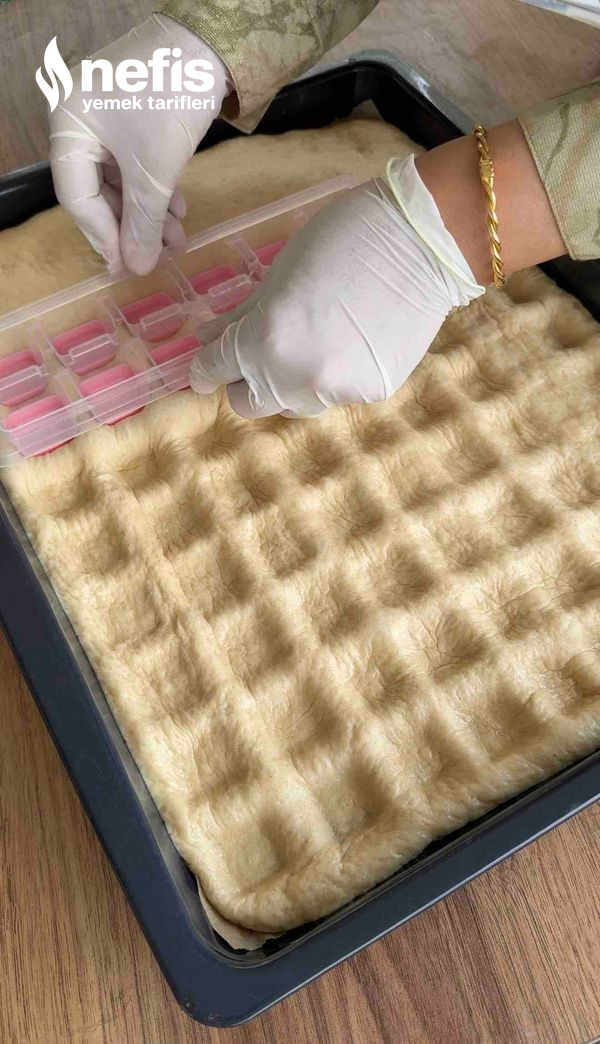 - Tepsi mayasının sonunda bir buz kalıbı gerisiyle hamura bastırıp boşluklar oluşturalım.