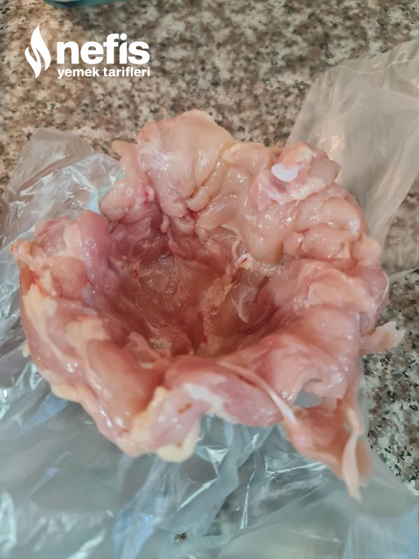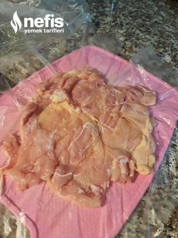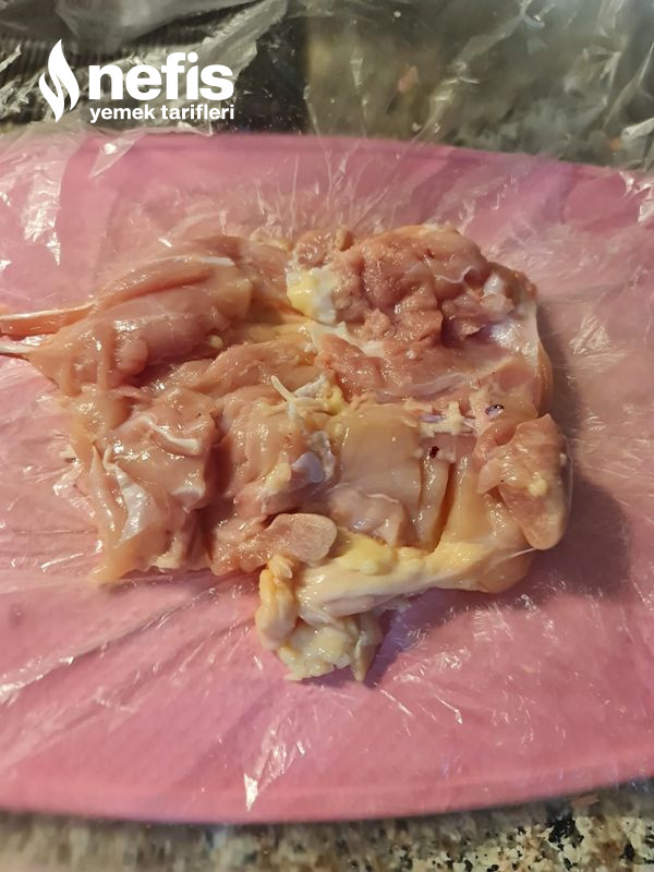 1. Tavuk but ve kalça kısmı bütün olarak kemikten ayrılıp iki buzdolabı poşeti ortasında dövülerek inceltilir.