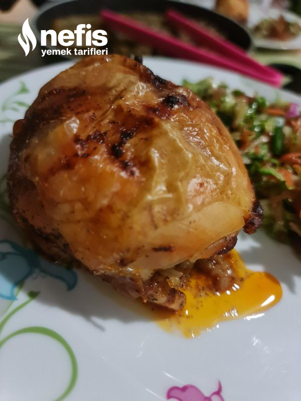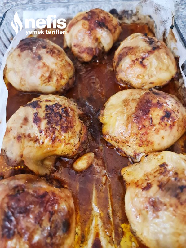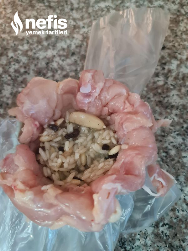 8. İçerisine pilavdan konulup tavuk kapatılır ve yağlı kağıt serili bir tepsiye dizilir.