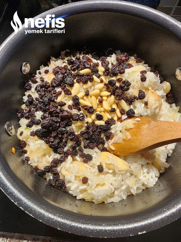 5. Dolmalık fıstık, kuş üzümü ve kabukları çıkarılmış badem, tuz karabiber eklenip kavrulur.