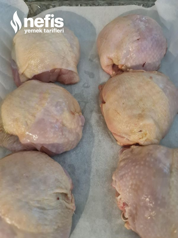 7. Bir kaseye tavukların derili kısmı alta gelecek halde yerleştirilir.