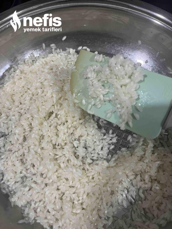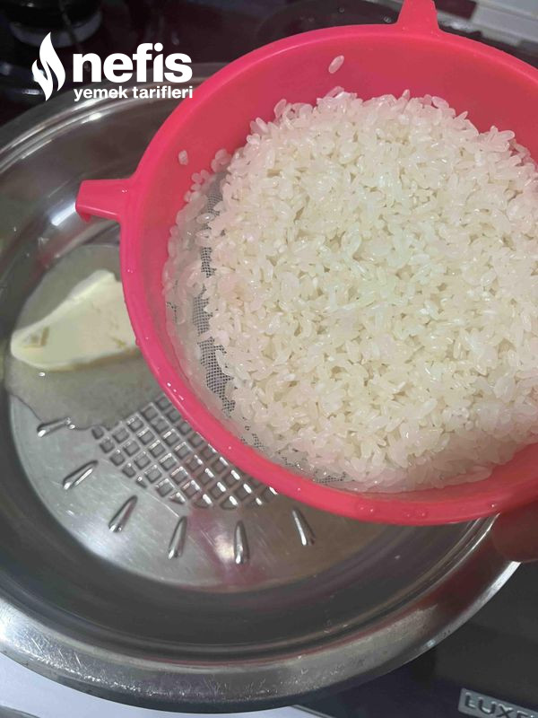 - Pirinçlerimizi beyaz suyu akıp duru su haline gelene kadar akan suda yıkayıp suyun dizilmesi için süzgeçte bekletiyoruz.