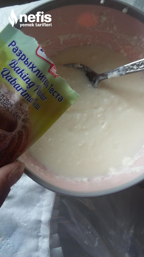 1. Önce 1 bardak yoğurt ve kabartmayl karişdirin bunu derin kapda yapın ki taşmasın.
