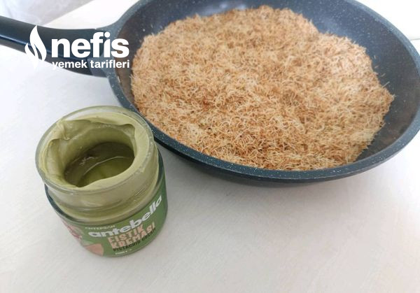 - Tabanı için; tereyağı eritilir, doğranmış kadayıflar orta ateşte kızarana kadar kavrulur.