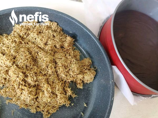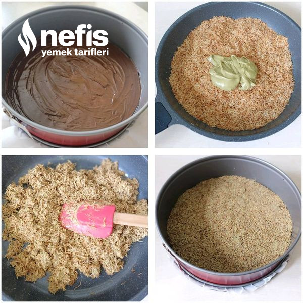 - Fırın kağıdı serili kelepçeli kalıbın tabanına evvel benmari eritilmiş çikolata yayılır, akabinde çikolata donunca da kadayıflı harç bastırılarak orantılı olarak döşenir. Buzdolabına kaldırılır.
