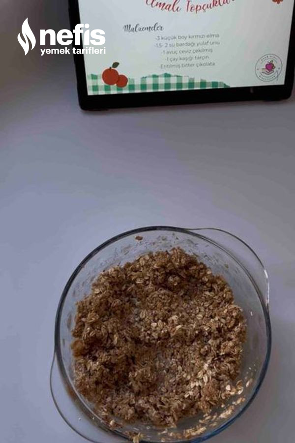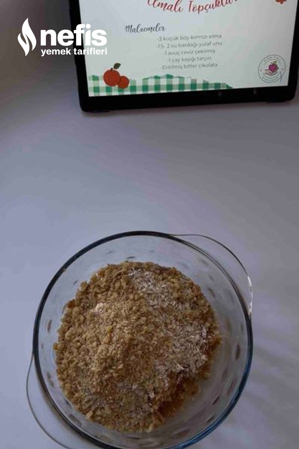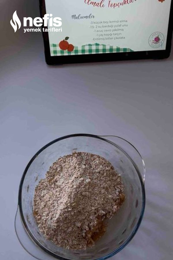 1. Rendelenmiş elma, çekilmiş yulaf unu ve çekilmiş ceviz içini bir kaba alalım.