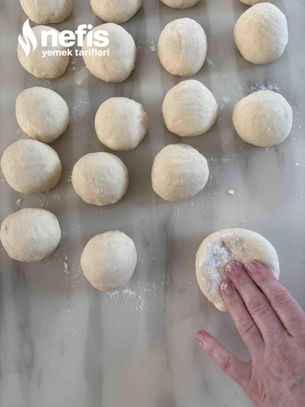 - Mayalanan hamuru 24 bezeye ayırınız elinizle üzerine bastırarak biraz acınız sonra merdane yardımıyla 1 cm kalınlığında küçük pasta tabağı büyüklüğünde açınız.