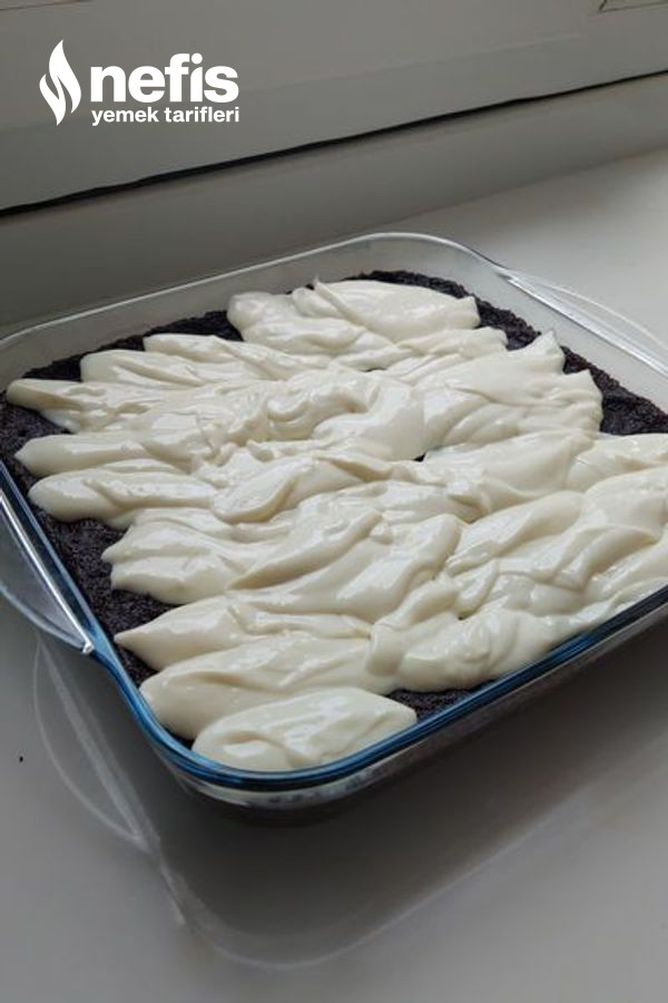 - Muhallebiye sıvı krema ekle 2-3 dakika çırp hazırladığımız muhallebiyi kekin üzerine dökelim.