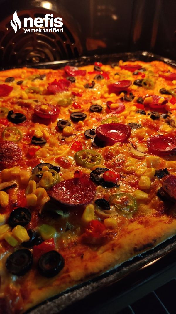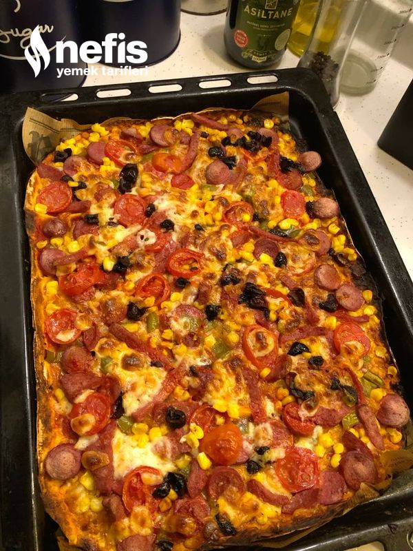 - Hamurun üzerine çatalla delikler açın ve sosu sürüp yazdığım yahut istediğiniz, elinizde olan malzemeyi üzerine dizin, kaşar hariç onu çıkmaya yakın ekleyeceğiz.