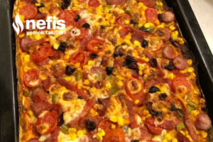 - Hamurun üzerine çatalla delikler açın ve sosu sürüp yazdığım yahut istediğiniz, elinizde olan malzemeyi üzerine dizin, kaşar hariç onu çıkmaya yakın ekleyeceğiz.