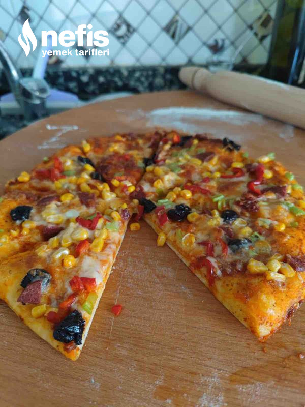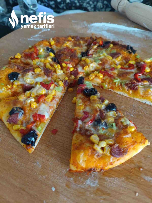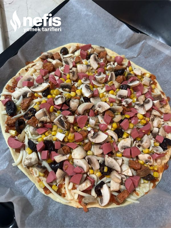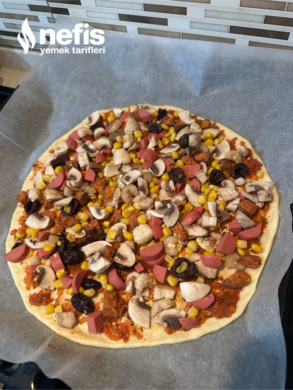8. Açılan hamurumuzu tepsimize yerleştirdikten sonra çatallayalım üzerine domates sosu sürelim kaşar peyniri serpelim ve sevdiğiniz tüm gereçleri yerleştirin.