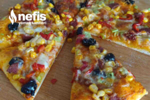 8. Açılan hamurumuzu tepsimize yerleştirdikten sonra çatallayalım üzerine domates sosu sürelim kaşar peyniri serpelim ve sevdiğiniz tüm gereçleri yerleştirin.