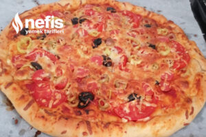 9. Doğradığımız biber domates, çekirdeği çıkarılmış zeytin, dilimli yeşil zeytin, sucuk, sosisi pizzanın üzerine sıralayalım.