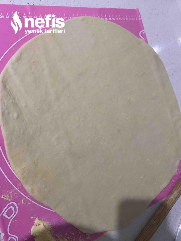 - Hamurumuzu büyük bir beze yapıyoruz ve düz bir yerde mısır unu yardımıyla evvel el ile biraz büyüyünce oklava ile büyülterek açıyoruz.