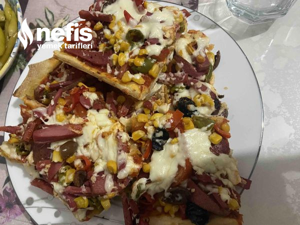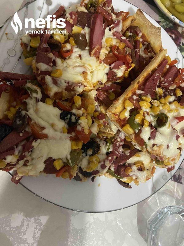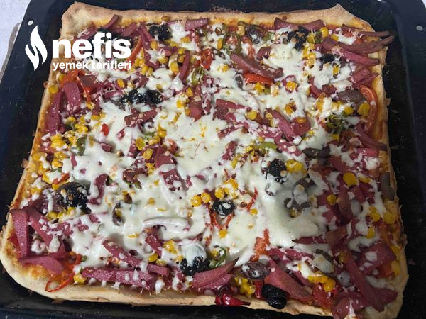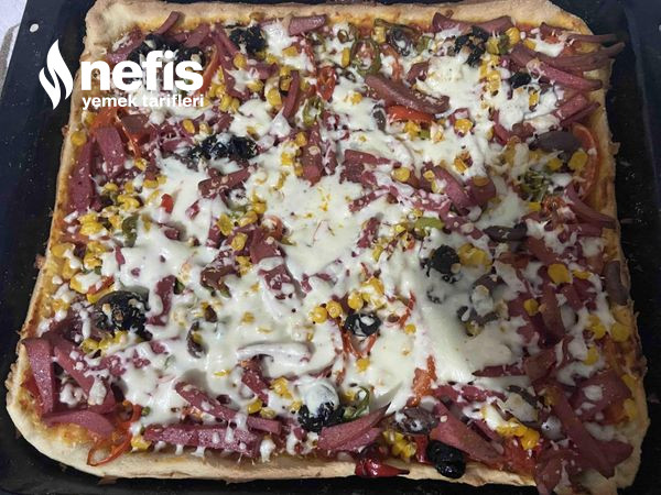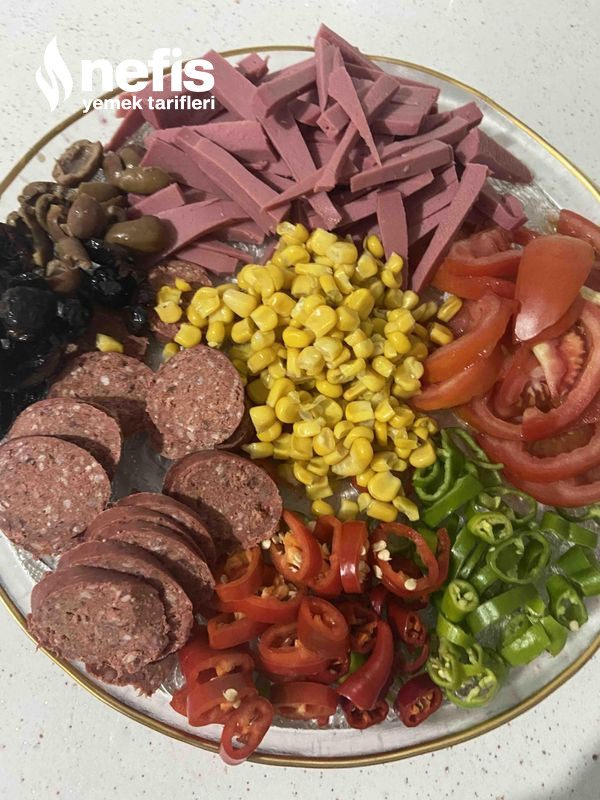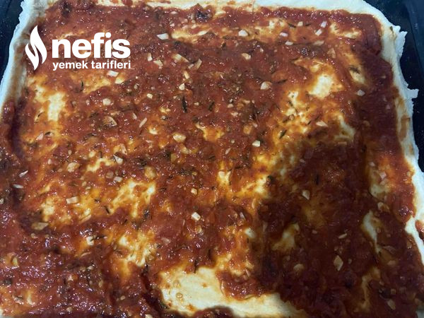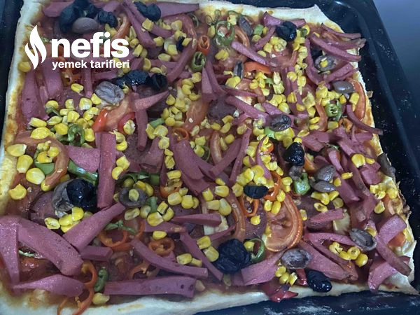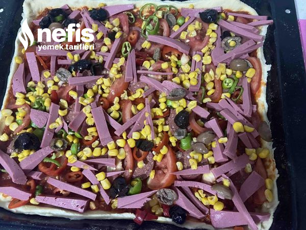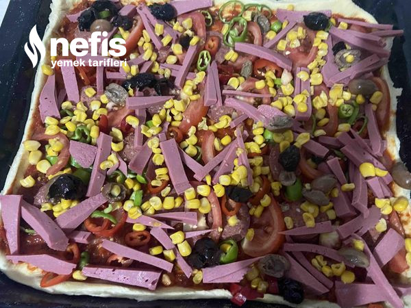 - Hamurumuzun üzerine sosumuzu yayıyoruz ve üzerine peynir hariç öbür gereçlerimizi yerleştiriyoruz.