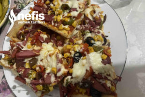 - Hamurumuzun üzerine sosumuzu yayıyoruz ve üzerine peynir hariç öbür gereçlerimizi yerleştiriyoruz.