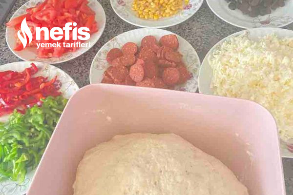 1. İlk evvel pizzamızın hamurunu hazırlayalım, 6 su bardağı un, 2 su bardağı ılık su, 1 yemek kaşığı kuru maya bunları ekleyip güzelce yoğuralım.