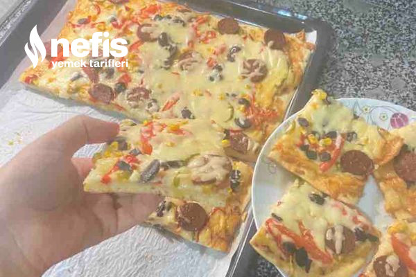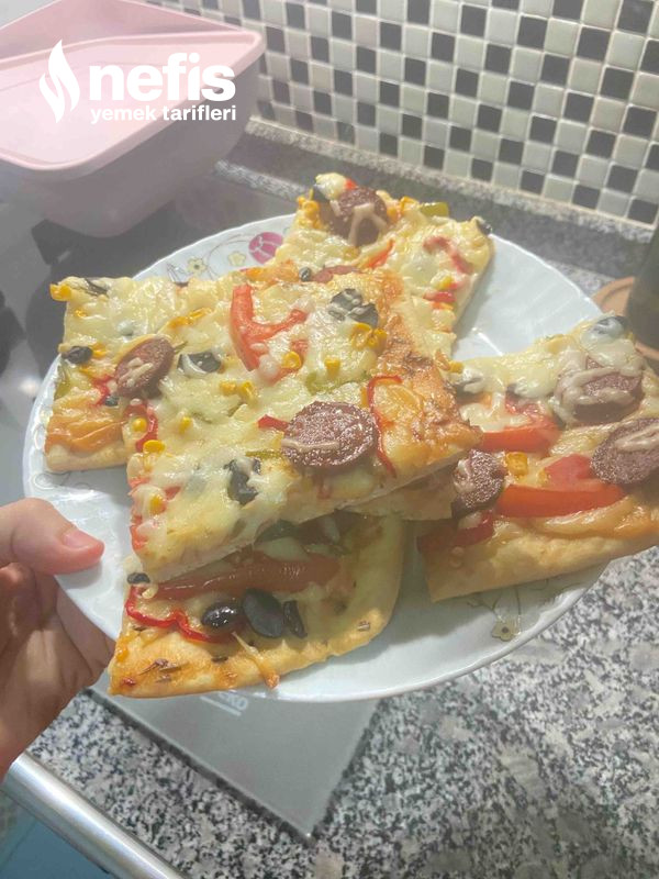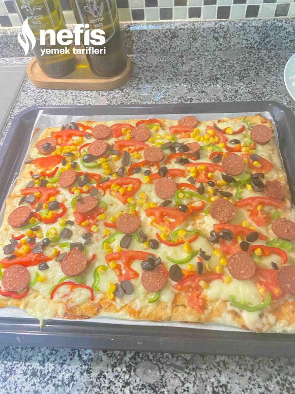 8. Yavaşaca üzerine dilediğiniz gereçleri ekleye bilirsiniz ben kaşar peyniri ekleyip 2 dk fırında beklettim daha sonra sucuk ,domates, biber ,zeytin mısır ekledin. 170 •c 15 dk pişirelim. Afiyet olsun 🌼.