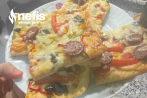 8. Yavaşaca üzerine dilediğiniz gereçleri ekleye bilirsiniz ben kaşar peyniri ekleyip 2 dk fırında beklettim daha sonra sucuk ,domates, biber ,zeytin mısır ekledin. 170 •c 15 dk pişirelim. Afiyet olsun 🌼.