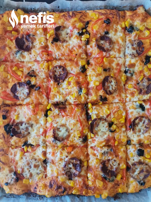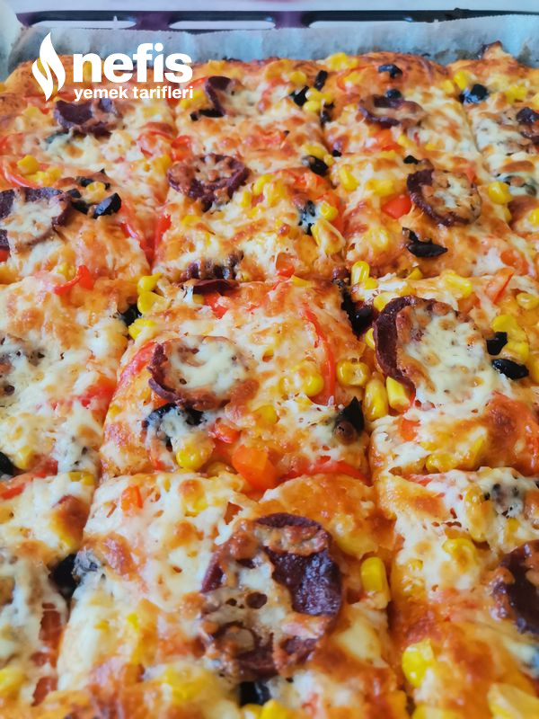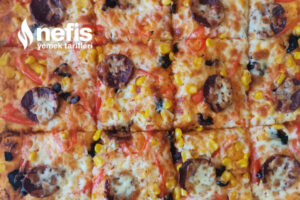 - Sonra sucuk, kaşar, sosis, zeytin, biber, mısır vs istenilen gereçler ile pizzanın üstü süslenir.