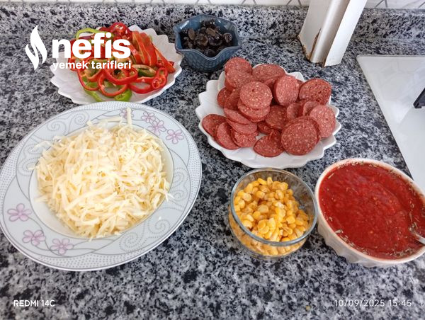 5. Salçalı sosu en alta üzerine sucuk ve başka gereçleri ekleyip kaşarda en üstüne gezdirelim.