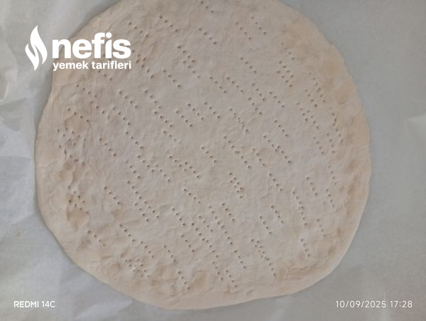 3. Mayalanan hamuru eşit 3 modüle bölelim ,bunu merdane yardımıyla hamuru açık yuvarlak kenarları kalın biçimde üzerinide kabarmasın diye çatala delelim .