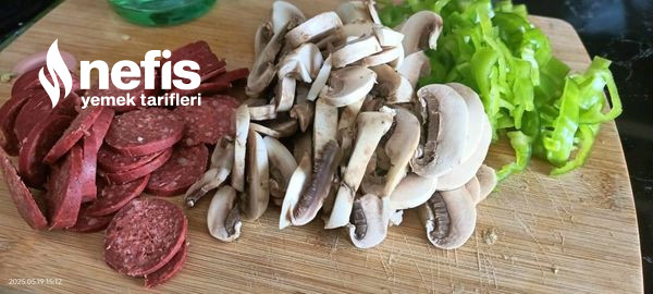 6. Sucuğu, biberi ve mantarı ince ince doğrayın. Kaşarı rendeleyin.