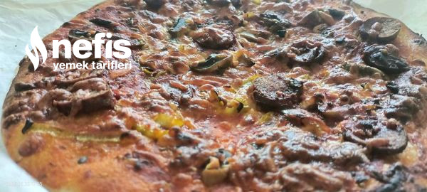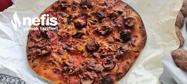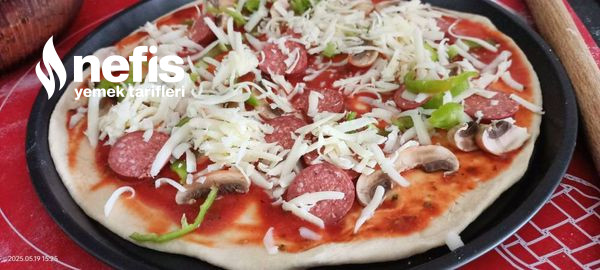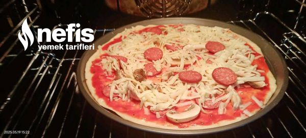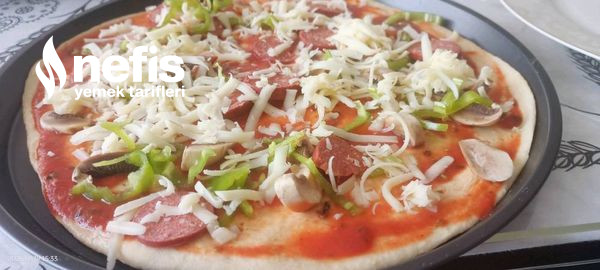 9. Hamurun tabanını çatalla delin. Evvel sosu düzgünce hamura yayın. Sonra da üst materyalleri yayın. En son kaşar rendesini serpin.