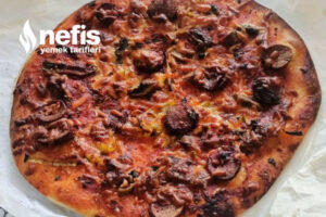 9. Hamurun tabanını çatalla delin. Evvel sosu düzgünce hamura yayın. Sonra da üst materyalleri yayın. En son kaşar rendesini serpin.