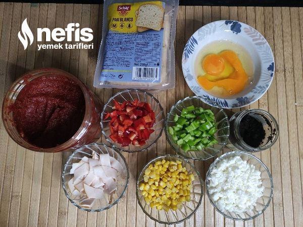 - İki yumurta, bir kaşık zeytin ezmesi ,bir kaşık biber salçası karıştırıyorum, bu karışım sonradan fazla geldi ekmekler yumuşamasın diye daha fazla sürmek istemedim evdekilere glutenli ekmekten üzerine yalnızca kaşar koyarak yaptım o denli de beğenildi😂 yada glutensiz ekmek sayısını artırabilirsiniz.