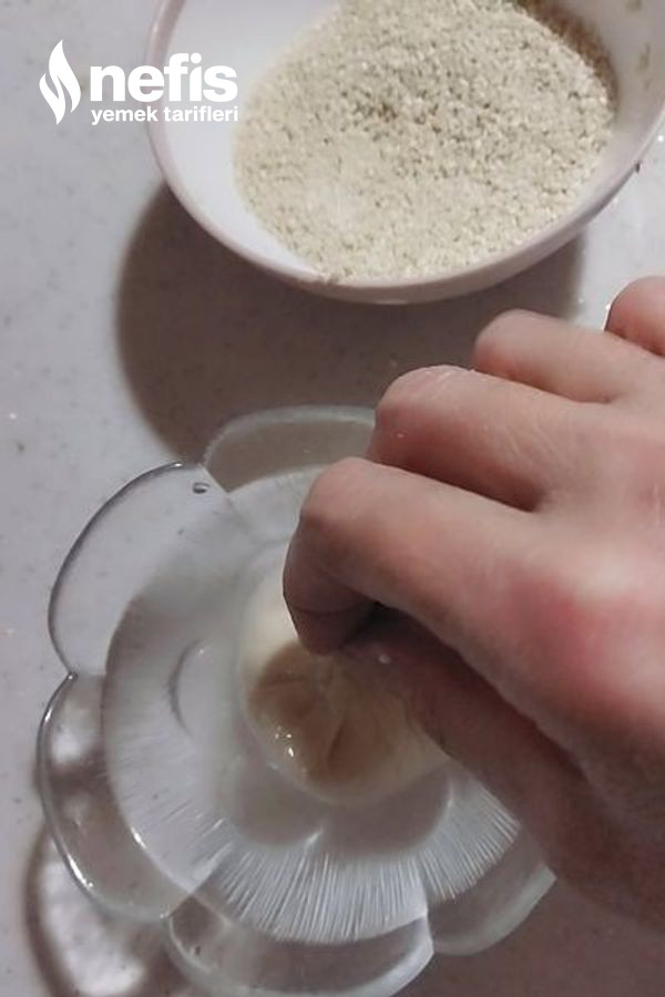 8. Ortalarına iç harçtan koyup kapatın, evvel suya batırıp sonra susama bulayın tepsiye yerleştirin.