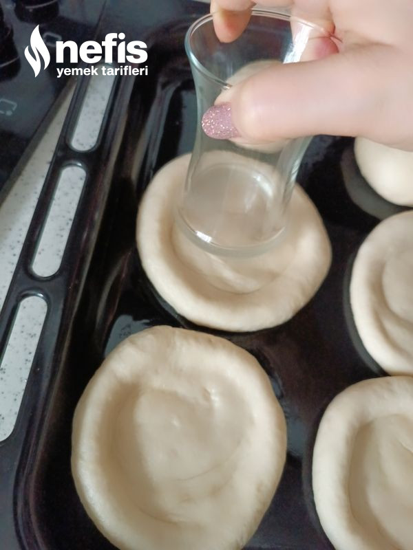 - Bir bardak yardımıyla bezelerin üzerine bastırarak ortası mümkün olduğunca çukur olacak biçimde yanlara gerçek açılır.