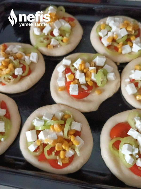 - Domates, biber ve mısırlardan birer tutam hamurların üzerine paylaştırılır.