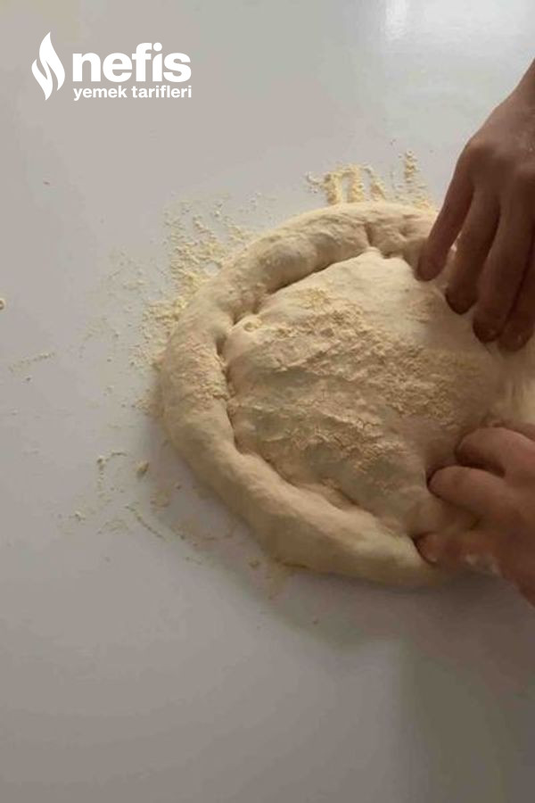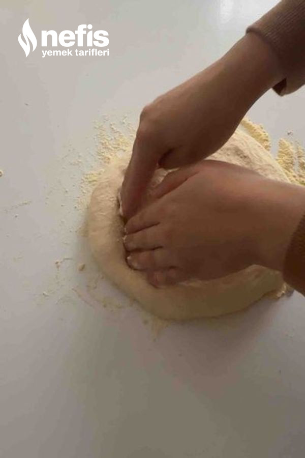 - Daha sonra isterseniz altına mısır unu ya da olağan unu da serpip kenarlarından iki santim içeride parmaklarımızla daire çizerek açıyoruz ve ortasına parmaklarımız katiyen bastırmıyoruz hamurun kenarından çekiştire çekiştir yuvarlak olmasını sağlıyoruz.