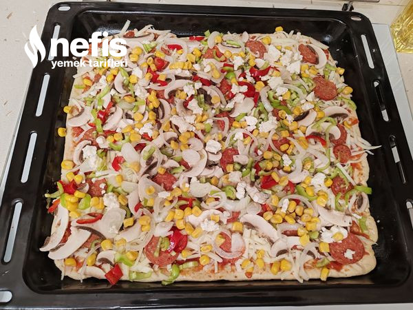 - Fırın güzelce ısındıktan sonra tepsiyi fırına atalım. Güzelce kızarınca pizzamız hazır. Deneyeceklere şimdiden afiyet olsun. :).