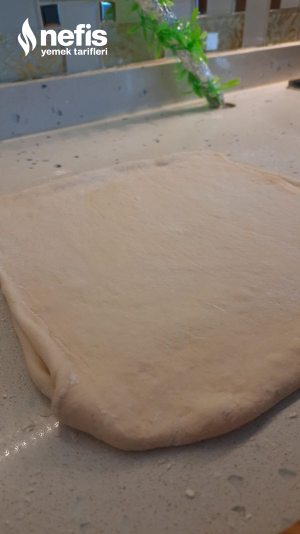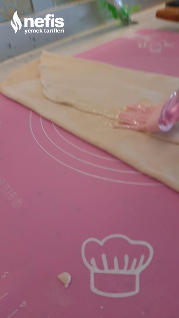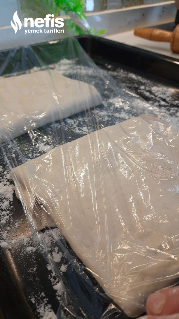 - Üstünü kapatıp yarım saat bekletelim daha sonra hamurumuzu ikiye bölüp, tezgaha hafif un serpiştirip, 60 cm açalım üzerine tereyağı fırçayla sürüp fotoğraftaki üzere üst üste katlayıp buzdolabında yağı donana kadar bekletelim.