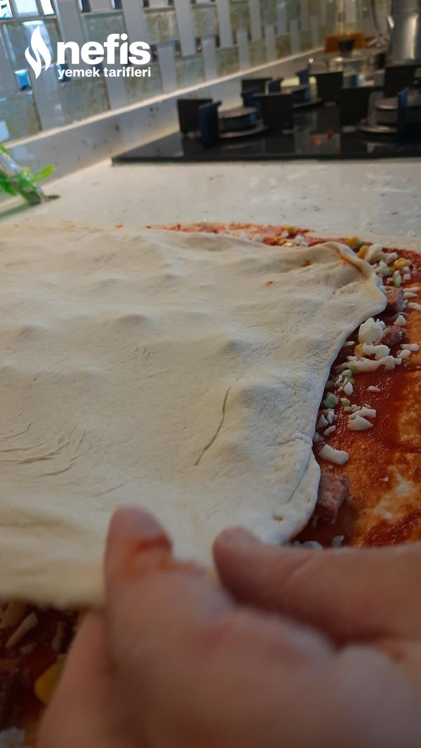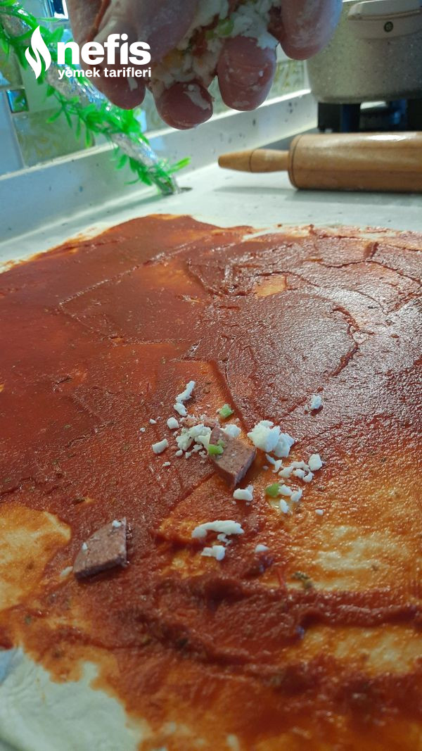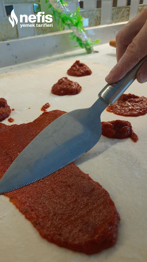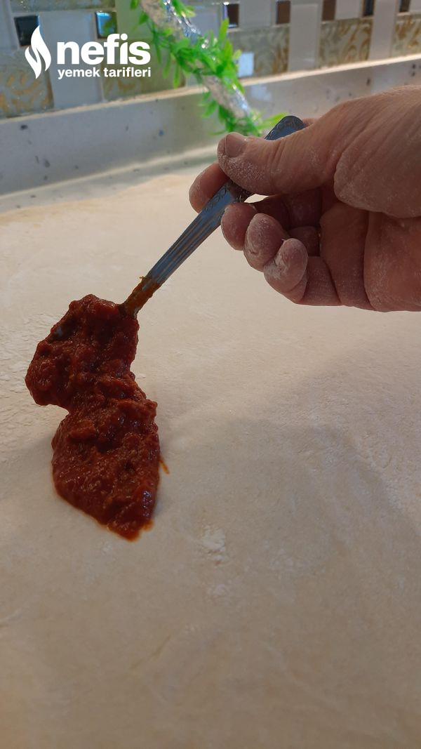 - Yarım saatin sonunda hafif un serpiştirdiğimiz yere hamurumuzu alıp 40mcm büyüklüğünde açıp sosumuzu sürüpiç harcımızı serpiştirelim.
