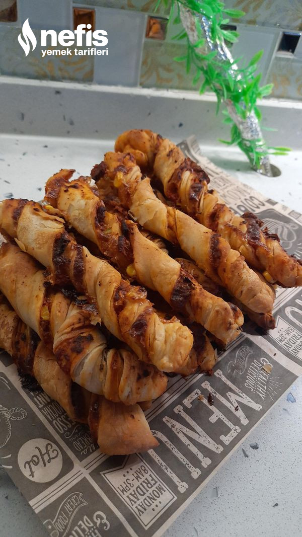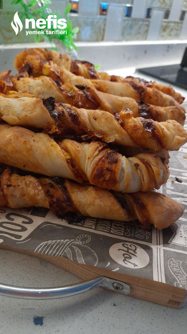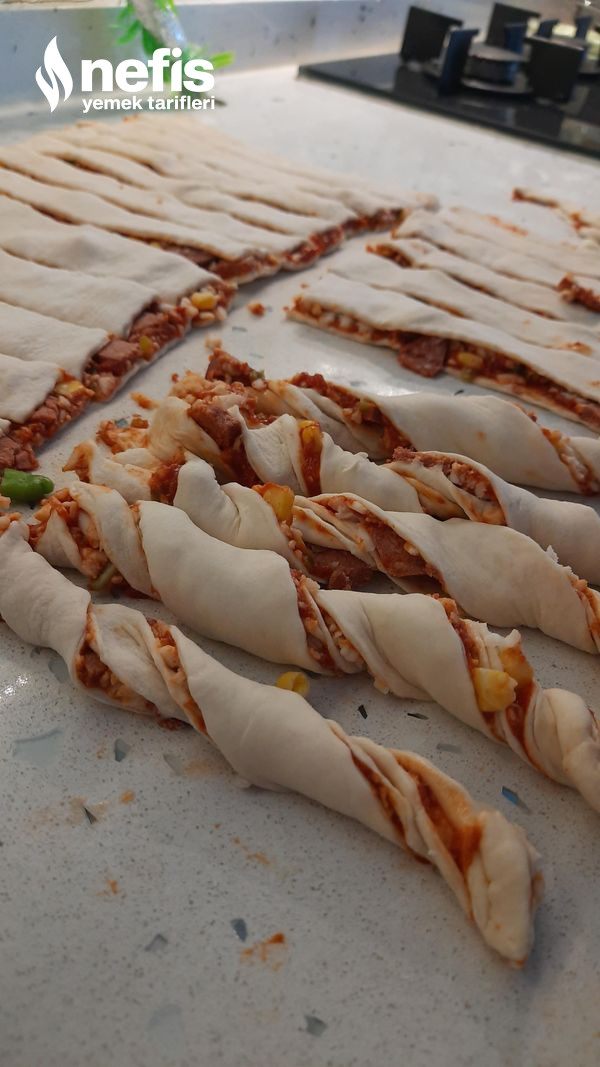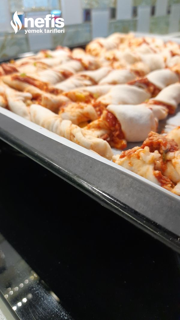 - Diğer hamurumuzuda açıp onun üstüne kapatıp evvel ortasından daha sonra 1,5 cm eninde kesip bükelim üzerine tereyağı sürüp 180 derecelik ısınmış fırında üstü kızarana dek pişirelim.
