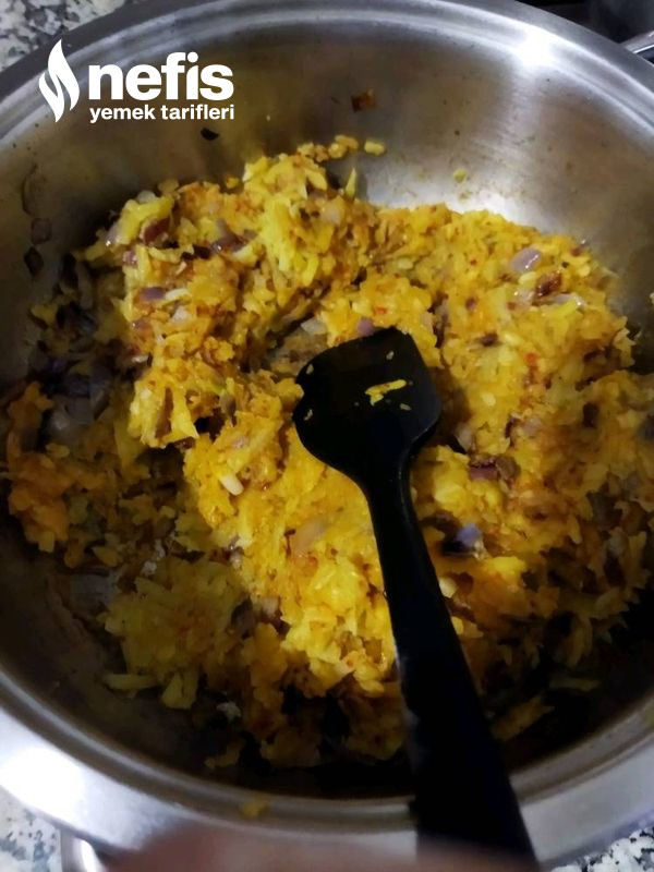 4. O esnada soğanlar doğranır sıvı yağda kavrulur, patatesi evvelce haşladım soğuttum kabuklarını soyup rendeledim, soğanlara ekledim kavurdum.