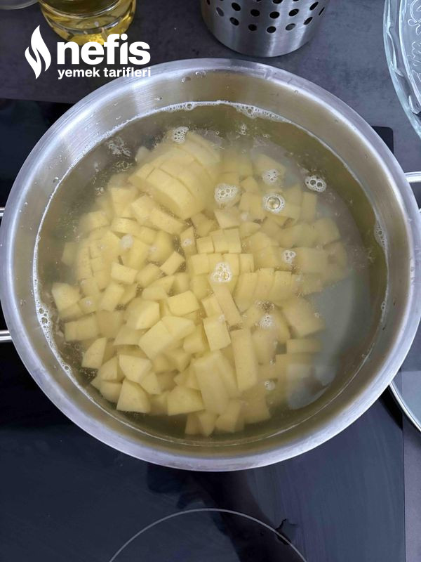 - Onu bu kaba alıp üstüne haşlanmış ve ezilmiş patateslerimizi ve baharatlarımızı ekliyoruz ve kenara koyuyoruz.