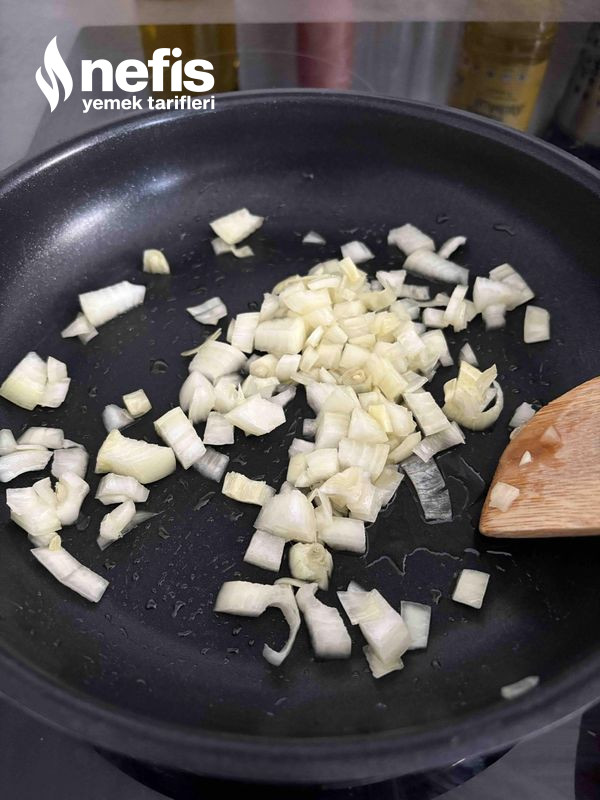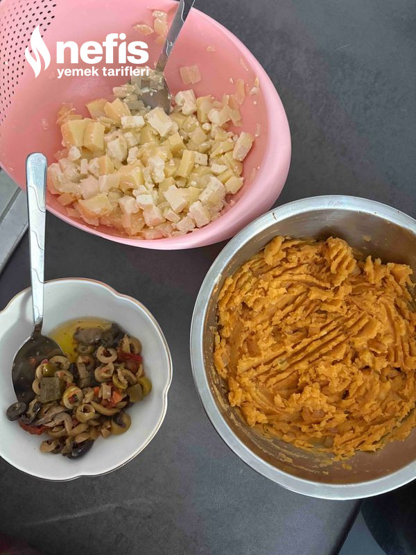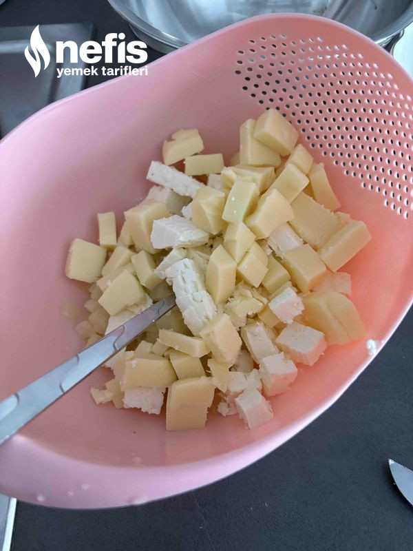 - Peynirli iç harç için; öteki soğanımızı da yemeklik doğrayıp tavada bol zeytin yağılı pembeleşene kadar kızartıyoruz ve bir kaba koyuyoruz. Üstüne küçük kestiğimiz beyaz peyniri, kaşar peynirimizi ekliyoruz. Zeytinlerimi de farklı bir kaba koyup kenarda beklettim.