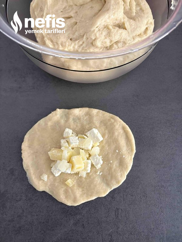 - Mayalanmış olan hamurumuzun havasını çıkartıyoruz ve küçük toplar koparıp açıyoruz hamuru. İç harcımızı çokça dolduruyoruz ben o denli top halinde kapattım. Siz istediğiniz imgeyi verebilirsiniz.