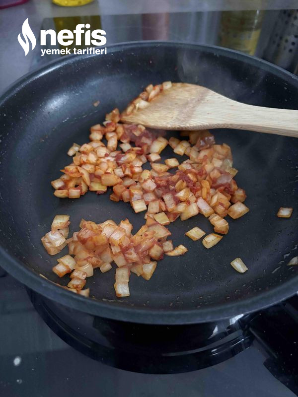 - O sırada iç harcımızı hazırlayalım: patateslerimizi küçük küçük kesip haşlıyoruz. Bir tavaya salçayı, zeytinyağı döküp 1 yemeklik doğradığımız soğanımızı pembeleşene kadar kızartıyoruz (yoksa poğaçanın içinde canlı kalabilir ben onu çok sevmiyorum) yağını biraz bol dökelim ki iç harcına daha yağ koymamıza gerek kalmaz.